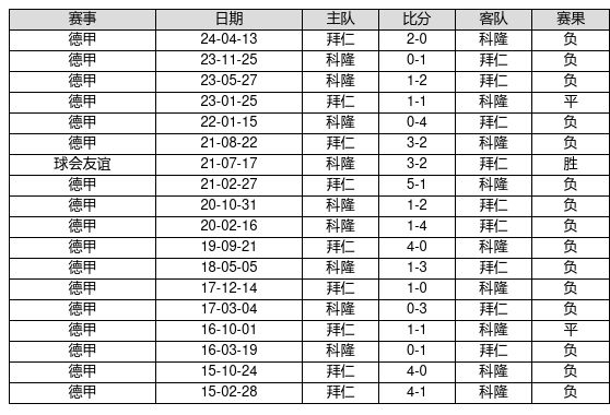 科隆 VS 拜仁两队近10年的交战次数为18场,科隆1胜2平15负,赢球概率为5.6%,平局概率为11.1%,输球概率为83.3%。