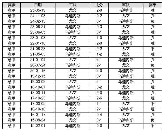 尤文 VS 乌迪内斯两队近10年的交战次数为22场,尤文16胜3平3负,赢球概率为72.7%,平局概率为13.6%,输球概率为13.6%。