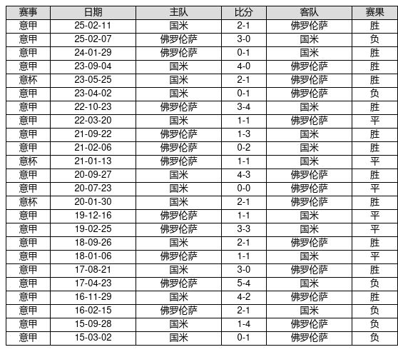 国米 VS 佛罗伦萨两队近10年的交战次数为24场,国米12胜6平6负,赢球概率为50.0%,平局概率为25.0%,输球概率为25.0%。