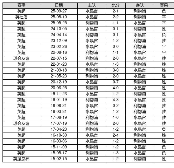 利物浦 VS 水晶宫两队近10年的交战次数为26场,利物浦17胜4平5负,赢球概率为65.4%,平局概率为15.4%,输球概率为19.2%。