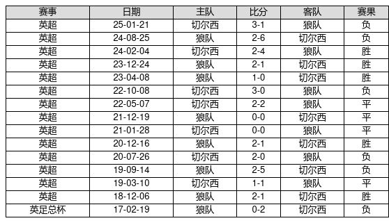 狼队 VS 切尔西两队近10年的交战次数为15场,狼队5胜4平6负,赢球概率为33.3%,平局概率为26.7%,输球概率为40.0%。