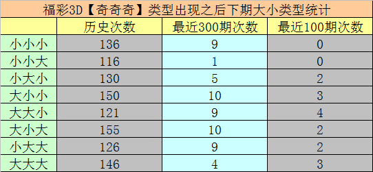 二、最近7次【大小大】奖号之后,其下期区分开出号码:723、967、752、805、767、051、933,其中组三号码出现2次,组六号码出现5次。本期看护组三号码出现。