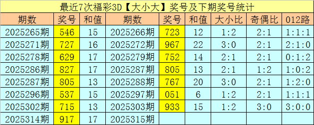 一、福彩3D上期奖号为917,大小类型开出:大小大,历史上该大小类型奖号共出现1081次,最近7次【大小大】奖号区分开出:546、727、629、827、805、537、715,其中组三号码出现1次,组六号码出现6次。