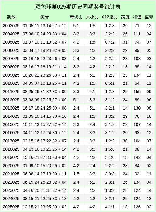 红球号码奇偶比为5:1,大小比为3:3,012路比为1:2:3,和值为89,跨度为28; 蓝球开出2路、大数、偶数号码14。 第2026025期双色球历史同时奖号分析