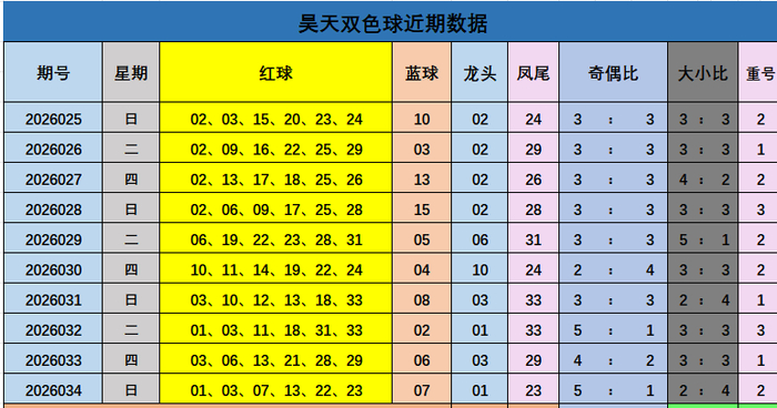昊天双色球本期概括推选: 大复式概括推选:03 04 05 09 10 14 15 16 18 24 25 26 28 30 33+02 03 09 12 14 小复式概括推选:03 04 05 10 15 18 24 28 30+02 03 12 精选6+1概括推选:03 10 15 18 28 30+12 上期奇偶比5:1,近10期奇偶比中,有6期比值为3:3,有1期比值为4:2,有2期比值位5:1,有1期比值位2:4。概括分析,本期推选奇偶比为2:4 大小比分析:上期红球大小比为2:4,小码走势占优,近10期大小比为31:29,大码走势占优,本期展望大小码出号疏导,推选大小码3:3。 重号分析:上期开出重号03,13。近10 期开出10期重号,共出现19个重号,本期展望重号出现03。 蓝球数据分析: 上期蓝球中奖号码为07,近10期蓝球概括奇偶比5:5,奇偶数走势疏导,本期推选偶数12。